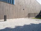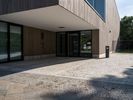 A skateboarder rides past an empty building in the city of Berlin, Germany. Modern architecture and urban design create a striking contrast against the clear sky. Straight roads and low-rise residential villas add to the charm of this urban landscape.