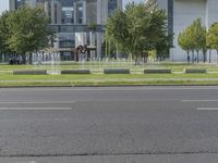 A serene city park in Berlin, Germany. The modern architecture of the buildings blends seamlessly with the lush green grass and tall trees. Clear skies and quiet streets create a peaceful urban oasis.