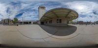 A skateboarder glides through a bustling city park, surrounded by towering office buildings and classic architecture. The fish eye lens captures the energy of the urban landscape. A perfect day for skateboarding in the metropolitan area.