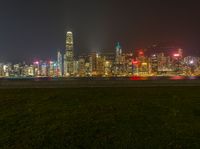 This image captures the profile of a city skyline at night, reflected in the calm surface of the ocean. The cityscape is illuminated by the glow of neon lights, creating an artificial light that contrasts with the dark and gloomy atmosphere. The grey sky adds to the mysterious and atmospheric feel of the scene. The grass surface and open space along the coastline provide a natural element amidst the urban design. This photo showcases the unique combination of city life and natural beauty, making it a captivating depiction of the urban coastal landscape.