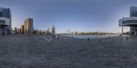 A stunning view of a metropolitan area in Holland, with modern architecture and high-rise buildings lining the cityscape. The city is surrounded by water, with a beautiful bridge spanning across the river. The clear sky highlights the azure beauty of the city. A perfect break of day in the Netherlands.