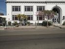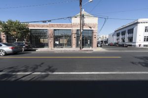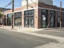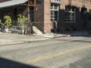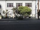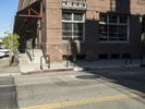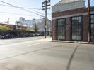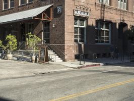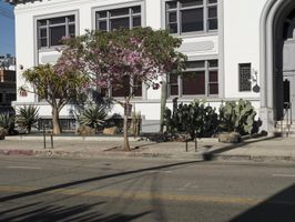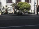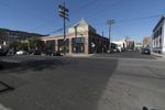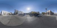 A unique architectural feature in the middle of a city road, creating an interesting panorama. The road's asphalt surface reflects the surrounding buildings and clear sky. A perfect day for exploring the vibrant mix of residential and commercial properties.