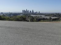 This is an image capturing the city skyline with roads and buildings in the foreground. The asphalt roads traverse through open spaces with grassy fields and residential areas. The clear sky provides a beautiful backdrop to this cityscape. The view from this vantage point shows the roofs of buildings and the horizon in the distance. This photo offers a comprehensive overview of the city's landscape, with its road surfaces, land lots, and packshots. It is a perfect representation of a typical day in this vibrant city.