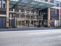 the entrance to an office building along a street is shown here, and it appears to be made of glass