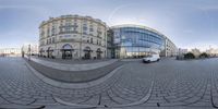 this is a fish eye view of an old building in the city with a very circular mirror effect