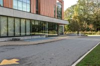 A view of a suburban residential area in Toronto, Canada. The scene features a theater building surrounded by trees and vegetation. The road surface and curbs are made of asphalt, creating a well-designed urban space.