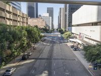A bustling metropolitan area with high-rise buildings and tree-lined streets. Cars travel along the busy road as pedestrians utilize the walkways. The clear sky accentuates the urban skyline.