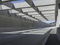 This image captures the architectural beauty of Los Angeles, California, with its stunning cityscape. The photo showcases a road that leads under a concrete bridge and into an underpass. The buildings in the background feature unique facades and lines, adding an abstract touch to the urban landscape. The concrete street and the steel infrastructure create a striking contrast, while the hard shadows cast by the buildings and the bridge create an intriguing visual effect. This photo truly captures the essence of urban life in Los Angeles.