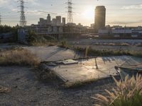 This image captures the cityscape of Los Angeles at dawn. The road, lined with buildings, stretches into the distance, reflecting the sunlight on its concrete surface. The residential areas and open spaces can be seen surrounded by trees. A factory emits pollution into the air while clouds hover above. The winter atmosphere adds a touch of coldness to the urban scene. As evening sets in, the city becomes even more vibrant with lights and contrasts. This photo is a packshot of the city's rugged beauty, capturing the clear sky and contrails.