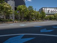 This stock photo features a city road with modern architecture. The asphalt road is surrounded by urban design. The scene is lit by bright daylight, creating hard shadows. The cityscape and cloudy sky provide a background for this urban scene.