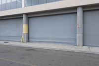 an industrial steel closed garage door is on the side of a street next to a large building