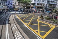 An elevated road in the urban landscape of Hong Kong, Asia. The high yellow lines curve through the city, creating a thoroughfare for transportation. Zebra crossings provide safe pedestrian access in this bustling metropolis.