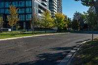 A clear sky day in Toronto, Ontario. Modern architecture and urban design, with hard shadows cast on the asphalt road. One quarter of the city is represented by the shopping mall and storefronts.