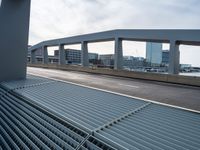 This stock photo features a stunning view of a long highway surrounded by a clear blue sky and fluffy clouds. The road surface is made of smooth asphalt, and the image is captured through a metal grate grid on a city street. The scene showcases the modern architecture and bustling city life of a metropolitan area. The photo also includes elements like a bridge, pier, and harbor, adding to the urban charm. The location of this particular scene is in Holland, Netherlands, a stunning city known for its urban design and business district. This image is perfect for illustrating concepts like urban, architecture, business, and city life in Europe.