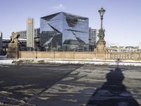 the shadow of a person riding a bicycle in a street in front of a tall glass building