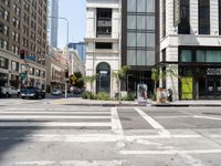 A view of Los Angeles city roads with classic architecture. Clear blue skies illuminate the urban landscape. The city's vibrant life blends seamlessly with the asphalt paths and sunny day.