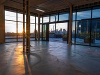 large open space with windows and a floor view at sunset with a skyscraper in the distance