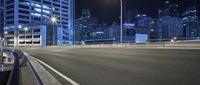 A night view of a city skyline with high-rise buildings and skyscrapers. Street lights illuminate the asphalt road surface and highways. The towers and buildings are lit up with electricity, creating a vibrant and bustling urban scene.