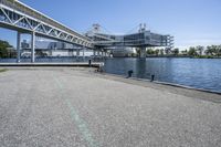 an empty road near the water near bridges and a pier on the river bank to the left side
