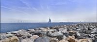 This stunning stock photo captures a city skyline view across the water, with rocks lining the coast area of an island. The image depicts a beautiful coastal scene during the day, with the ocean and sea in the background. The shoreline is adorned with rocks and gravel, creating an open space for exploration. In the distance, you can see the cityscape and skyline, with towering buildings and a prominent tower. The foreground features a quarry and a lighthouse, adding to the charm and uniqueness of the location. The surface of the water is serene, with contrails visible in the sky. This captivating image transports viewers to the coastal city of Dubai in the United Arab Emirates - a popular tourist destination known for its urban charm and Arabian heritage.