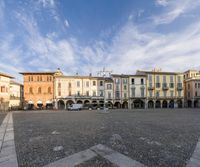 Urban design at its finest in the city square. People leisurely stroll through the public space, surrounded by beautiful architecture. The clock tower and arched archways add charm to the scene.