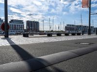 This stock photo features a city street lined with benches and boats anchored at the dock. The clear sky and asphalt road surface create a vibrant urban setting. The modern architecture and residential areas add to the charm of this European city. Taken in Bremen, Germany, this image captures the essence of city life with its cobblestone roads, urban design, and bustling harbor.