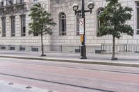 This photo showcases a city street in Dallas with classic architecture. The image features a sidewalk lined with street lights and a building with windows on the side. The architecture of the building is reminiscent of classic design. The street is located within a bustling business district, with a crosswalk and trees lining the road. The photo captures the urban setting and infrastructure of the neighborhood, making it a great representation of city life in Dallas.