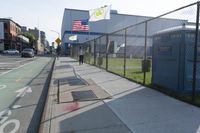 This stock photo captures a serene city street at dawn in New York City, USA. The roads are paved with asphalt, lined with buildings and residential areas. The prominent feature is a brick wall structure, which adds character to the urban landscape. The road surface is smooth, with clearly marked lanes and a curb separating the pedestrian area from the road. The image showcases the infrastructure and public spaces of the city, as well as the hard shadows created by the rising sun. Perfect for illustrating the bustling atmosphere of a city morning commute or showcasing the architectural details of a New York neighborhood.