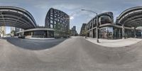 A unique perspective of a city street captured through a fish-eye lens. Distorted lines and vibrant colors create a dynamic urban scene. Office buildings, residential areas, and trees line the road, while vehicles and pedestrians move through the bustling cityscape.