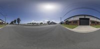 A unique view of a city street captured with a fish eye lens, creating a circular lens effect. The road surface and asphalt blend with the surrounding buildings and vegetation. A perfect representation of urban real estate.