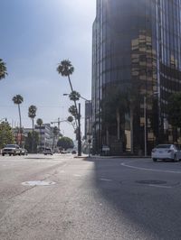 A view of a modern office building in downtown Los Angeles. The clear sky and hard shadows create a striking urban landscape. The busy streets and bustling business district showcase the vibrant energy of this iconic city.