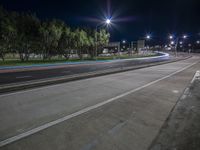 A concrete street illuminated by street lights on a dark night. The road surface is smooth asphalt, leading to a clear sky above the urban landscape. The urban design showcases the modern infrastructure.