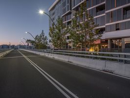 A panoramic view of a bustling city street with tall buildings on a bridge. The city comes alive at night with artificial lights illuminating the urban landscape. Clear skies and a break of dawn add a touch of serenity to the modern architecture.