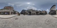 A fish eye lens shot of a city street, capturing the vibrant urban design. The black asphalt road and grey buildings create a symmetrical composition. Windows and facades line the street, while vegetation adds touches of green. A dynamic snapshot of city life.