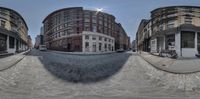 a 360 view lens of a cobbled down street and buildings in the middle of the day