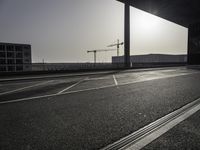 This image captures the city at dawn, with sunlight casting a warm glow on the asphalt road and green grass. The buildings create a vertical skyline against the cloudy grey sky, creating a contrast with the horizontal lines of the road and street lights. The parallel lines of the road surface and the rectangular shape of the buildings give the image a distinctive style. The tints and shades in the sky add depth to the overall composition. This photo represents the start of a new day in the city.