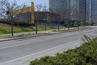 This image captures a typical day in a suburban neighborhood in Ontario, Canada. The foreground shows the side of a road with trees lining it. Several modern buildings can be seen in the background, representing the urban architecture of the area. A bicycle is also visible, indicating the city life and transportation in the neighborhood. The image showcases the blend of nature and infrastructure, with the leafy vegetation and the road surface. This photo represents the urban design and residential properties of Ontario, specifically in the suburb of Toronto.