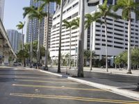 A modern urban landscape in Miami Beach, Florida. High-rise buildings and modern architecture stand tall against a clear sky. The city life buzzes with activity on the busy roads and parking lots. Palm trees and vegetation add a touch of nature to the urban design.