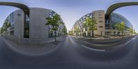 A snapshot of Berlin's modern architecture at dawn. Straight down the road, two buildings stand in perfect symmetry. The monochrome scene is highlighted by the dawn's yellow sunlight. A glimpse into Berlin's urban design.