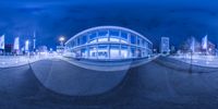 A blurred image of a modern building in Berlin. The night lights create streaks of light, adding to the dynamic cityscape. This metropolitan area showcases the city's architectural diversity and urban design.