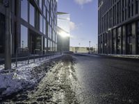 This is an image of a cityscape with buildings and roads. The photo captures the vibrant urban design of a neighborhood, showcasing high-rise buildings and public spaces. The sunlight seeps through the trees, casting shadows on the asphalt road surface. The city is surrounded by water, adding to the picturesque view. The image showcases a perfect blend of architecture, nature, and urban life. It's a representation of the bustling energy and modernity of a city.