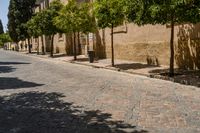 A vibrant cityscape of Cordoba, Spain during a sunny day. People can be seen walking on a sidewalk surrounded by beautiful trees and buildings. In the distance, more people can be spotted, adding to the urban atmosphere. This photo captures the essence of the city, showcasing its classic architecture and the lively ambiance. The city is known for its rich history and cultural heritage, making it an ideal destination for architecture enthusiasts and museum-goers.