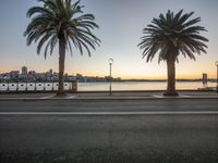 Cityscape at Dawn on a Coastal Road with Palm Trees