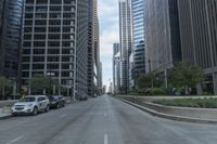 This stock photo captures the vibrant cityscape of downtown Chicago, Illinois. The image showcases the modern architecture of high-rise buildings and skyscrapers scaling the skyline. A bustling street can be seen with cars passing by on either side, as the road stretches straight ahead. The metropolitan area is captured during daylight, providing a clear view of the city's urban landscape. The image showcases the thriving metropolis and the busy thoroughfare that defines the heart of Chicago.