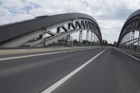 This stock photo features a stunning cityscape of Frankfurt, Germany. The image showcases the city's beautiful architecture and a prominent arch bridge. The picture captures the hustle and bustle of urban life, with cars moving along the road and the clouds adding to the scenic view. The modern infrastructure and well-maintained highway highlight the city's advanced transportation system. The image is taken during the day, capturing the vibrant energy of Frankfurt's metropolitan area.