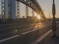 A stunning view of Frankfurt, Germany at dawn. The city's architecture is beautifully illuminated by the golden light of the rising sun. The tied-arch bridge casts a striking shadow across the road, while clear skies and contrails add to the sunny atmosphere. Experience the vibrant cityscape of this metropolitan area in Europe.
