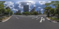 the view of a street in a city from a wide angle, with two traffic lanes in between the road and buildings