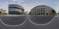 A couple of street view shots of Berlin, Germany. The modern architecture of high-rise buildings lines the road surface. The clear sky and glass walls reflect a futuristic cityscape. A symmetrical composition of buildings creates a stunning profile.