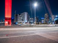 The modern architecture of Holland's city skyline glows under the night sky. Busy highways run under the bridge as street lights illuminate the road. A vibrant cityscape in the heart of Europe.