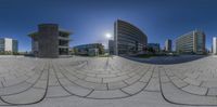 A unique perspective of Lisbon's urban landscape captured through a fish eye lens. The modern architecture of high-rise buildings and skyscrapers contrasts with the open spaces and green vegetation. The city's business district is highlighted by the clear sky and hard shadows. A vibrant and symmetrical cityscape.